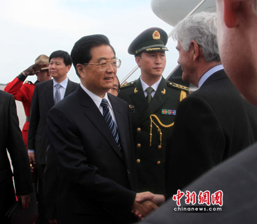 在機(jī)場(chǎng)發(fā)表的書面講話中,胡錦濤首先表示,很高興再次來到美麗富饒的“楓葉之國”加拿大進(jìn)行國事訪問。