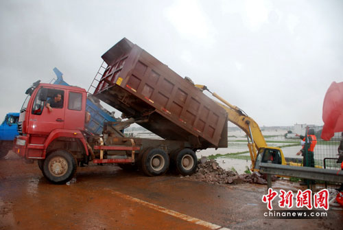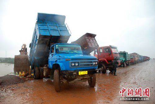 中新網(wǎng)臨川6月24日電(張見悅 劉占昆 何柳斌)江西撫河唱凱段數(shù)百米米決口封堵方案已經(jīng)確定,24日中午,記者在福銀高速撫河大橋看到,大批工程車輛運載石料,準備鋪就一條運輸通道延伸向決口初,決口封堵的外圍工程在雨中開始緊張進行。