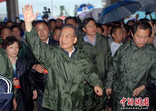 當日上午,溫家寶冒雨深入重災區(qū)撫州羅針鎮(zhèn),察看汛情、災情,看望受災群眾,慰問奮戰(zhàn)在抗洪搶險一線的解放軍、武警、公安消防官兵。