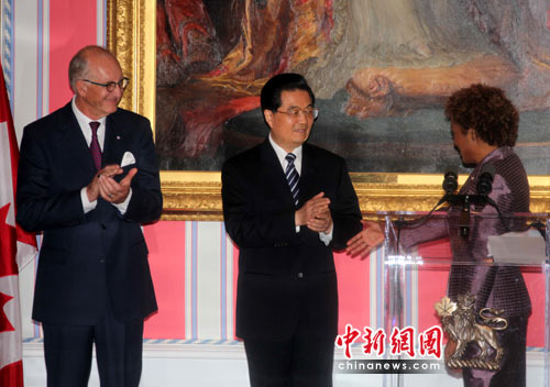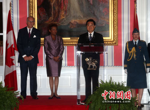當?shù)貢r間24日上午,正在這里進行國事訪問的胡錦濤在加拿大總督府會見加拿大總督米夏埃爾•讓。會見前,米夏埃爾•讓夫婦為胡錦濤的到訪舉行了隆重的歡迎儀式。米夏埃爾•讓還發(fā)表了熱情的歡迎辭。
