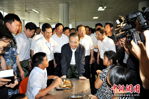 溫家寶總理十分惦記受災(zāi)群眾的吃飯問題。他走進(jìn)食堂時,數(shù)百位受災(zāi)群眾正在吃晚飯?偫砼c正在吃飯的鄉(xiāng)親們拉起家常,“你們是一家人嗎?吃的怎么樣?”鄉(xiāng)親說:“我們有一家人在,在學(xué)校食堂吃得很好,有葷有素,比自己家還要豐盛些。感謝黨和政府,感謝總理!”看了大家吃得很香,總理才放心地離開食堂。
