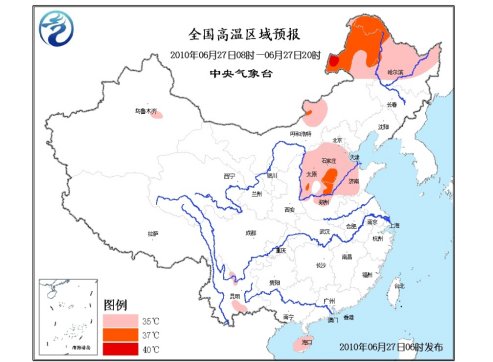 中新網(wǎng)6月27日電 中央氣象臺(tái)6月27日06時(shí)繼續(xù)發(fā)布高溫藍(lán)色預(yù)警:預(yù)計(jì),今天白天,內(nèi)蒙古東北部和中部的部分地區(qū)、黑龍江大部、山西大部、河北中南部、京津南部、河南北部、山東中西部、海南大部等地有35~37℃的高溫天氣,其中,內(nèi)蒙古東北部、黑龍江西北部、河北南部等地局部最高氣溫可達(dá)38℃以上。