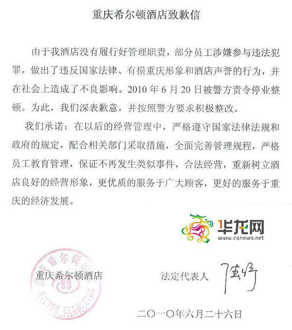 2010年6月20日,重慶希爾頓酒店因股東涉黑,介紹、容留婦女賣淫,違法經(jīng)營和故意擾亂社會(huì)秩序,被重慶警方責(zé)令停業(yè)整頓。今日16時(shí)40分,重慶希爾頓酒店法定代表人陸紓,通過華龍網(wǎng)記者就此事公開發(fā)表致歉信,承諾合法經(jīng)營,更好地服務(wù)重慶經(jīng)濟(jì)發(fā)展。