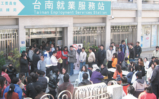 昨天各地就業(yè)服務站被擠爆,“勞委會”緊急將服務時間延長兩小時到晚上七點。據(jù)統(tǒng)計,十一個大型就業(yè)服務站一天內(nèi)涌進一萬六千人,是去年春節(jié)后第一天一千五百人的十倍多,其中近八成、約一萬兩千八百人請領失業(yè)給付,激增三十倍,去年開春后第一天只有四百四十人。
