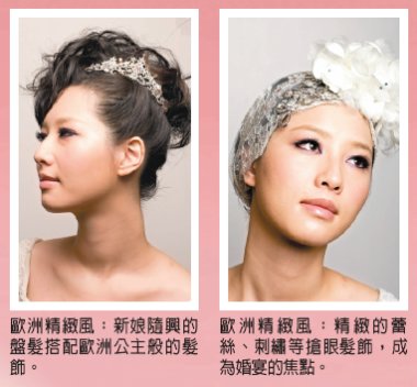 今年時尚界有許多飾品設(shè)計(jì)師出頭,在秀場上常見搭配夸張飾品的造型。怕麻煩的新娘,在發(fā)型上可以盡量簡單,只要更換不同的華麗發(fā)飾,就可以變出多樣風(fēng)格,尤其適合拍婚紗照或宴客中場短時間換裝時使用。