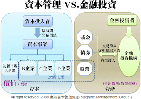 由人組合而成,會運用到人的智慧的、而非僅止于資產(chǎn)價格低買高賣的,都屬于事業(yè)的范疇,也是資本管理的范疇。因此,不只是上市的企業(yè),未上市的企業(yè),也包含在內(nèi)。例如,入股于朋友開設(shè)的早餐店,作為長期股東,信賴管理者的誠信與努力,投入資本共同承擔(dān)營運上的挑戰(zhàn),也享受獲利所帶來的經(jīng)濟盈余。