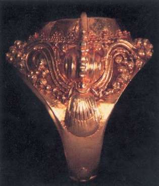例如附圖的印度黃金指環(huán),工藝甚精美,浮雕圖案富有民族風格,獨特典麗,就是十九世紀初期的代表作。其實,我國晉代時也有鏨刻典麗花紋的金指環(huán),當然風格大相徑庭,但更如鳳毛麟角。