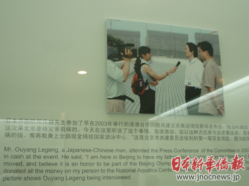 國家游泳中心“水立方”是由107個國家和地區(qū)的35萬港澳臺同胞和海外華僑華人共同捐資9.4億元建設的。展覽入口處大大書寫著“永不泯滅赤子心”深深打動了每一個在場的人。