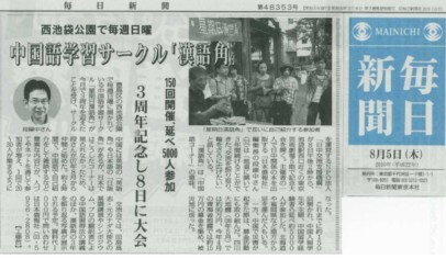 《每日新聞》的報(bào)道指出,在中國(guó)有英語(yǔ)角和日語(yǔ)角,在日本卻一直沒(méi)有這類交流組織。日本僑報(bào)社總編輯段躍中于2007年8月創(chuàng)辦了東京星期日漢語(yǔ)角。在每周日下午大約2個(gè)小時(shí)內(nèi),參加者用漢語(yǔ)進(jìn)行自我介紹和簡(jiǎn)單的聊天。如今,參加者逐漸增多,每次都有20-30人參加。參加者有中國(guó)留學(xué)生、家庭主婦和曾去中國(guó)留學(xué)的日本人,甚至有人從北海道和福岡縣趕到東京參加漢語(yǔ)角,三年來(lái)累計(jì)有5000人次參加。