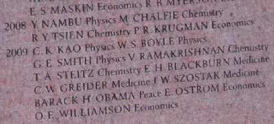 此次新刻上的11個名字是2009年諾貝爾獎的得主,其中包括高錕和George E. Smith等三位物理獎得主、Thomas A. Steitz等兩位化學(xué)獎得主、Jack W. Szostak等三位醫(yī)藥類獎得主、Oliver E. Williamson等兩位經(jīng)濟獎得主和獲得和平獎的美國總統(tǒng)奧巴馬的名字。