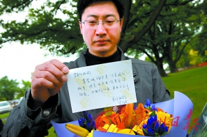陳先生還特意買了兩束鮮花,其中一束粉紅色的玫瑰是他補送的情人節(jié)鮮花,他在寫給妻子的留言中說:“這次你要永遠留著,不要再扔垃圾桶了。”
