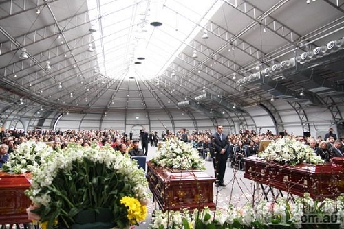 追思會(huì)的最后階段,所有親友和來賓陸續(xù)上前,向遺體告別并進(jìn)獻(xiàn)獻(xiàn)花,會(huì)場內(nèi)響起了歌曲《回家》。下午一點(diǎn),眾人目送靈柩離場。五具靈柩被運(yùn)送前往麥夸里墓園。