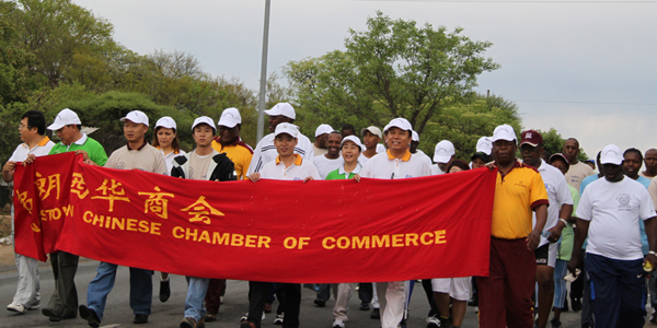 博茨瓦納警察總署署長齊馬科、中國駐博茨瓦納使館參贊茍皓東、領(lǐng)事郭斌、佛朗西斯敦警署、佛市華人華僑和印巴商人等約200人參加了游行。游行過程中,當(dāng)?shù)孛癖、印巴裔人紛紛加入游行?duì)伍。