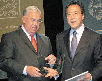 中新網(wǎng)10月9日電 據(jù)美國《世界日報(bào)》報(bào)道,美國波士頓一年一度慶祝新移民和多元文化的慶典宴會(huì)“我們就是波士頓”(We are Boston),6日晚假波士頓會(huì)議中心舉行,900多名與會(huì)者向獲頒2009年度領(lǐng)袖獎(jiǎng)的華裔大提琴家馬友友致敬。