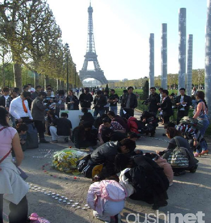 數(shù)百名在法留學(xué)生和華人于18日在巴黎艾爾菲鐵塔前的和平墻點(diǎn)起蠟燭,為青海玉樹地震的遇難者祈福。他們將數(shù)百支蠟燭擺成巨大的心形和“玉樹”字樣,然后逐一將蠟燭點(diǎn)燃,與此同時(shí),祈福板上也留下他們各式的祝福語,表達(dá)自己對災(zāi)區(qū)同胞們血脈相連的感情。望著燃燒的蠟燭,留學(xué)生和華人高呼“玉樹加油”,衷心的祈求青海玉樹地震中的生者平安,死者安息;顒游簧俾愤^的法國人和游人也停下腳步,為玉樹地震的死難者哀悼。
