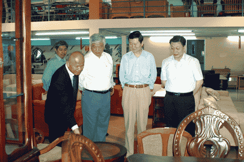 馬儒沛首先來到巴拿馬家具城,受到潘文亮董事長和他兩位兒子的熱情接待,馬儒沛參觀了面積達(dá)九千多平方米的店面,深感驚嘆,他詳細(xì)地向潘文亮詢問了關(guān)于家具市場的開發(fā)、廠房擴(kuò)建、創(chuàng)立自主品牌、原材料成本等方面的問題。