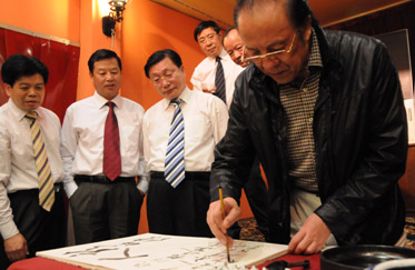 晚宴上,著名歌唱家楊洪基揮毫灑墨,為阿根廷華人華僑聯(lián)合總會(huì)題字,代表團(tuán)成員也一一落款簽字。