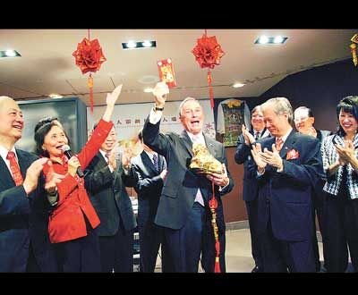 中新網2月25日電 據美國《僑報》報道,紐約市長彭博23日來到華策會人瑞中心,向華裔耆老拜年。人瑞中心主任伍寶玲按華人過年傳統(tǒng)給彭博送上仿真金馬、金虎和紅包,彭博喜笑顏開,開心地摸著虎頭,希望給紐約帶來好運。