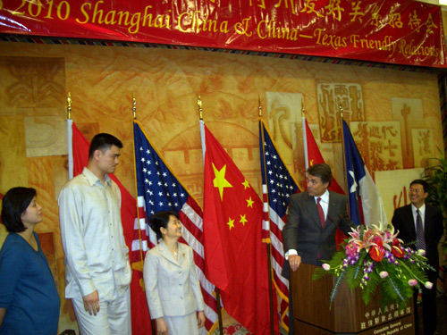 作為特別的嘉賓,姚明也發(fā)表了感言。他出生在上海,對(duì)上海有著特殊的感情。在德州休斯頓打球幾年來(lái),他覺得也有必要向家鄉(xiāng)和祖國(guó)人民介紹德州“牛仔們”的生活和經(jīng)濟(jì)文化科技發(fā)展?fàn)顩r。他非常高興佩里州長(zhǎng)能親自率團(tuán)參加上海世博會(huì)。