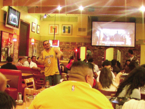 在華裔聚居區(qū)的清吧、飯店及西餐廳里,到處都聚集了湖人的球迷,他們說,買不起決賽的門票,聚在酒吧里,也可以增加一些看球的氣氛。他們一邊吃著烤雞、炸薯?xiàng)l,還可以喝一點(diǎn)啤酒,并高聲為自己喜歡的科比高喊“MVP”,“MVP”,很是來勁。
