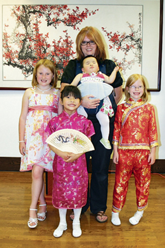 參加晚會(huì)的眾多家庭中,一位女士一直在胸前抱著一個(gè)中國女孩,無論觀看表演還是吃飯,從沒有把女孩放下過。她就是康肯(Lisa Konkin)。康肯夫婦已經(jīng)有6個(gè)孩子,年長的4個(gè)已經(jīng)長大成人,還有兩個(gè)女兒Caroline和Madeline。幾年前,康肯夫婦決定從中國收養(yǎng)孩子,經(jīng)過了近3年的漫長等待后,才抱起現(xiàn)年6歲的Hanna-Lin。