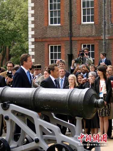 在英國(guó)BBC舊址,薩科齊和夫人布呂尼在卡梅倫和英國(guó)查爾斯王子的陪同下,為一座戴高樂(lè)紀(jì)念碑揭幕。在卡林頓園林,薩科奇向戴高樂(lè)和丘吉爾的雕像獻(xiàn)花。