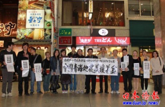 災(zāi)情就是命令!災(zāi)難無(wú)情,人間有愛(ài)!4月22日(星期四),愛(ài)媛松山一大早下起了多年未見(jiàn)的瓢潑大雨,但愛(ài)媛縣的同胞和日本友人仍然按照約定的時(shí)間,冒著大雨毅然走上街頭,開(kāi)始了由聯(lián)合會(huì)帶頭部署倡導(dǎo)的聲勢(shì)浩大的街頭募捐活動(dòng)。由三十多人組成的募捐隊(duì)伍,彼此不分中國(guó)人還是日本人,用真心與熱情共同譜寫(xiě)、詮釋人間大愛(ài)——心向玉樹(shù),情系災(zāi)區(qū)!四幅由聯(lián)合會(huì)副會(huì)長(zhǎng)、旅日山水畫(huà)家牛子華即時(shí)揮毫寫(xiě)就的《愛(ài)媛縣華僑華人聯(lián)合會(huì) 中國(guó)留學(xué)生學(xué)友會(huì) 日中友好協(xié)會(huì):為中國(guó)青海地震義援募金》的巨大橫幅在指定地點(diǎn)拉開(kāi)了,募捐隊(duì)伍懷抱著十多個(gè)由聯(lián)合會(huì)事務(wù)局準(zhǔn)備的專用募捐箱,拉開(kāi)了活動(dòng)的序幕!鞍萃袨橹袊(guó)青海地震災(zāi)區(qū)獻(xiàn)愛(ài)心”的募捐聲,聲聲入耳。向來(lái)對(duì)救災(zāi)特別熱情的日本國(guó)民開(kāi)始駐足慷慨解囊……和兩年前祖國(guó)汶川大地震賑災(zāi)募捐情景同樣感人的一幕再次在同一地點(diǎn)重新演繹。我們禁不住熱淚盈眶——祈福災(zāi)區(qū)人民!衷心感謝熱情、善良、友好的人們!第一天共募集到58,700日元。