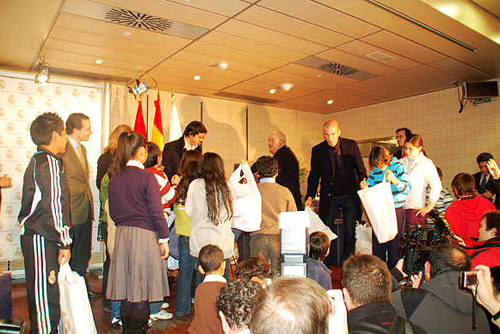 中新網(wǎng)12月26日電 據(jù)西班牙《歐華報》報道,由皇馬基金會發(fā)起“每個孩子都有玩具”的活動,日前在馬德里伯納烏球場內(nèi)舉行。皇馬現(xiàn)役超級球星卡卡,及退役球星齊達(dá)內(nèi)到場給馬德里兒童代表送出“第一份”圣誕節(jié)禮物。毛尚雅等4名華裔小朋友作為馬德里華僑子女代表,參觀了皇馬博物館、伯納烏球場及球員休息室等地,并在活動中上臺領(lǐng)取禮物,接受電視臺采訪。