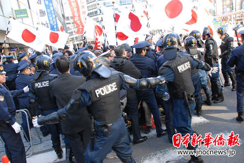 當(dāng)他們?cè)诰瘝徢敖腥陆Y(jié)束后,準(zhǔn)備前往“陽(yáng)光城”物產(chǎn)店前騷擾搗亂。這個(gè)時(shí)候,警方機(jī)動(dòng)隊(duì)一擁而上,將他們團(tuán)團(tuán)圍住,并且在四周設(shè)立了鐵欄障礙。他們發(fā)瘋般狂喊口號(hào),做著“突圍”的動(dòng)作。警方機(jī)動(dòng)隊(duì)絲毫不為所動(dòng)。一輛寫(xiě)著“以恢復(fù)主權(quán)為目標(biāo)之會(huì)”的面包車開(kāi)了過(guò)來(lái),跳下一個(gè)小頭目高喊:“我們?nèi)コ卮焓鹂棺h!我們申請(qǐng)后拿到了許可,為什么不允許我們?nèi)?”然后,他們分散陸續(xù)前往池袋警察署。