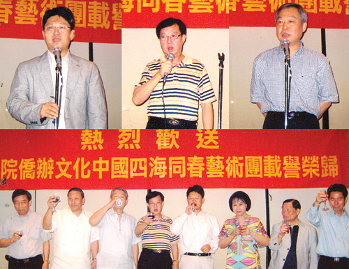 中國(guó)駐菲大使館白天代辦,王軍領(lǐng)事等使館領(lǐng)導(dǎo),藝術(shù)團(tuán)團(tuán)長(zhǎng)熊昌良,藝術(shù)團(tuán)全體演員和菲華各界聯(lián)合會(huì)名譽(yù)主席,常務(wù)委員、委員等出席了歡送宴會(huì)。中國(guó)駐菲大使館白天政務(wù)參贊、藝術(shù)團(tuán)團(tuán)長(zhǎng)熊昌良,菲華各界聯(lián)合會(huì)主席戴宏達(dá)先后致詞。該會(huì)委員們與藝術(shù)家們歡聚一堂,大家觸光交錯(cuò),氣氛熱烈。