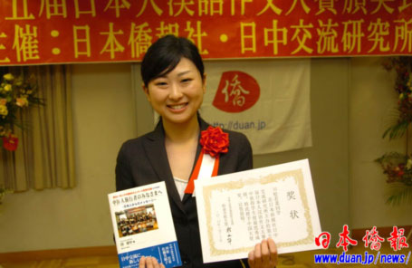 日本麗澤大學(xué)中文系三年級(jí)學(xué)生川松若菜的作文抓住“赴日中國游客激增”這一現(xiàn)實(shí),以“致訪問日本的中國旅行者”為題,給中國游客提出了溫馨的提示和建議,獲得中國駐日使館程永華大使簽署的“中國大使獎(jiǎng)”。