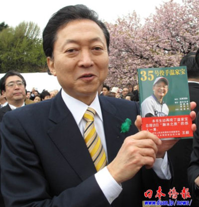 張景子說,鳩山首相在賞櫻會上對《35號投手溫家寶》一書表示出了極大的興趣,仔細端詳良久,并高高舉起讓大家拍照,表現(xiàn)了他對日中關(guān)系的高度重視和對溫家寶總理再次訪日的期待。鳩山首相的秘書一直把《35號投手溫家寶》握在手里,讓很多參加賞櫻會的日本朋友看到了該書的封面、特別是溫家寶總理充滿笑容的精彩照片,這也說明日本各界期待溫總理再次訪問日本。