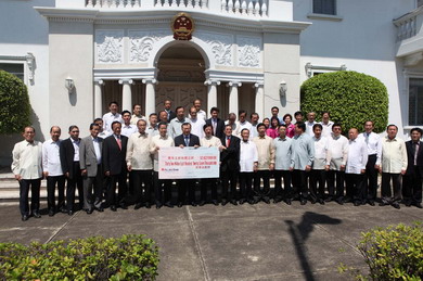 菲律賓商聯(lián)總會理事長黃禎潭、菲華各界聯(lián)合會主席戴宏達一行4日上午來到中國駐菲使館,親手向劉建超大使遞交了由這兩個菲華社團發(fā)動當?shù)厝A人華僑為玉樹災(zāi)區(qū)籌得的善款3287.7萬比索(約合500萬元人民幣)。