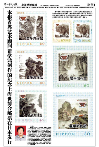 中新網(wǎng)5月18日電 據(jù)日本《關(guān)西華文時(shí)報(bào)》報(bào)道,5月15日,該報(bào)首席藝術(shù)顧問曲學(xué)鴻創(chuàng)作的紀(jì)念上海世博會(huì)郵票在日本發(fā)行。為了紀(jì)念上海世博會(huì)的勝利召開,他把中國壯麗的山水美景與上海世博會(huì)中國館結(jié)合在一起進(jìn)行繪畫創(chuàng)作,創(chuàng)作了一套6幅紀(jì)念郵票圖案,并由日本郵便株式會(huì)社發(fā)行。