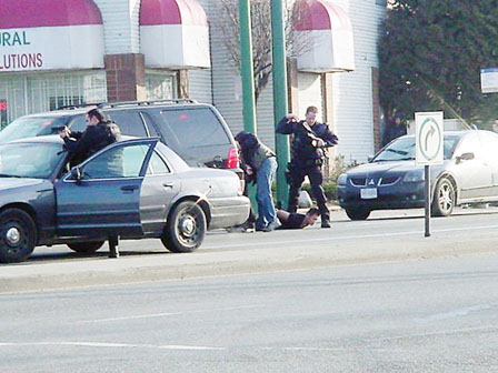 警員在早上7時許,繼續(xù)展開連串拘捕行動,包括于菲沙街(Fraser St.)夾京士威截停一部汽車,拘捕一名亞裔男子,以及在緬街(Main St.)夾東南海旁大道(SE Marine Dr.)截停另一車,拘捕一男一女。據(jù)目擊者稱被捕者均為亞裔,并可能是華裔。警方在行動中,曾在上述鬧市投擲曳光彈,然后由持長槍的緊急應變部隊警員沖近汽車,近距離擎槍指嚇下,喝令車上人士落車束手就擒。