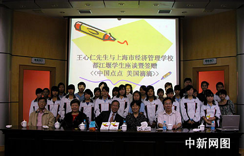 今天的贈(zèng)書(shū)儀式上,王心仁先生與大家分享了他的人生經(jīng)驗(yàn)。當(dāng)了解到去年汶川大地震后上海市經(jīng)濟(jì)管理學(xué)校接收了近70名來(lái)自上海對(duì)口支援地區(qū)四川都江堰的學(xué)生時(shí),王心仁先生勉勵(lì)這些遠(yuǎn)離家鄉(xiāng)的同學(xué)能夠珍惜學(xué)習(xí)機(jī)會(huì),并向這些學(xué)生每人送上了一張上海交通卡,希望他們多多了解這個(gè)城市。