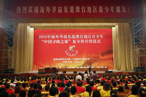 中新網(wǎng)北京7月25日電(記者 張冬冬)由中國(guó)國(guó)務(wù)院僑務(wù)辦公室、中國(guó)海外交流協(xié)會(huì)共同主辦的“2010年海外華裔及港澳臺(tái)地區(qū)青少年‘中國(guó)尋根之旅’夏令營(yíng)”,今天上午在北京人民大會(huì)堂舉行盛大的開營(yíng)式。來自世界51個(gè)國(guó)家和港澳臺(tái)地區(qū)的6000余名華裔青少年興高采烈,歡聚一堂。