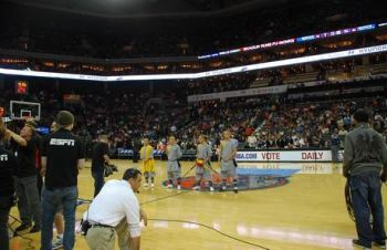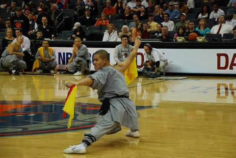中場休息期間在全場觀眾經(jīng)久不息地助威聲下,費(fèi)佛爾大學(xué)孔子學(xué)院邀請的4位功夫大師由愛美麗·羅德女士率領(lǐng)步入球場中央,功夫大師們恭謹(jǐn)?shù)叵蛉珗鲇^眾行佛禮。這時(shí)賽場主持人以NBA式的渾厚嗓音向現(xiàn)場觀眾發(fā)布: “讓我們熱烈歡迎今晚的特別嘉賓,費(fèi)佛爾大學(xué)孔子學(xué)院少林功夫大師,他們給我們帶來了擁有1700年歷史的中國地道的少林功夫!