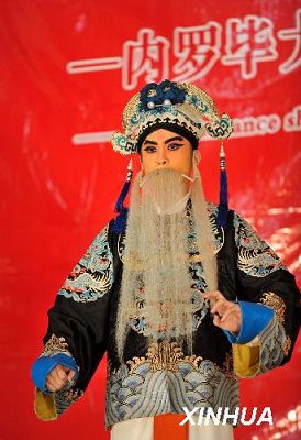 10月12日,在肯尼亞首都內(nèi)羅畢,一名來(lái)自北京理工大學(xué)的大學(xué)生在聯(lián)歡會(huì)上表演京劇。當(dāng)天,200多名來(lái)自北京理工大學(xué)、內(nèi)羅畢大學(xué)孔子學(xué)院和津巴布韋大學(xué)孔子學(xué)院的大學(xué)生們?cè)趦?nèi)羅畢大學(xué)舉行聯(lián)歡會(huì),同學(xué)們以合唱、舞蹈等精彩的節(jié)目交流情感傳遞友誼。(新華社/徐速繪 攝)