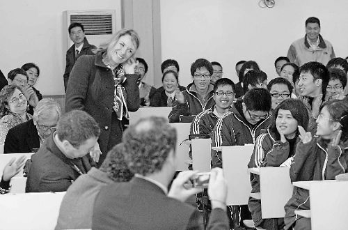 昨天(8日)上午9點(diǎn),杭州學(xué)軍中學(xué)的英語(yǔ)課堂上,出現(xiàn)了一群洋面孔——美國(guó)中小學(xué)校長(zhǎng)代表團(tuán)正坐在教室里旁聽?赡芤?yàn)轭^一次聽中國(guó)老師上英語(yǔ)課,美國(guó)校長(zhǎng)們都有點(diǎn)興奮,有幾位校長(zhǎng)甚至自告奮勇代替學(xué)生回答老師的提問,引得課堂上掌聲笑聲不斷。這是記者見過的氣氛最輕松的一堂對(duì)外公開課。
