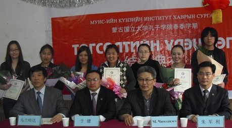 中新網(wǎng)5月26日電 據(jù)國家漢辦網(wǎng)站消息,5月21日,蒙古國立大學(xué)孔子學(xué)院隆重舉行了春季學(xué)期結(jié)業(yè)典禮。院長(zhǎng)于健、副院長(zhǎng)其米德策耶、院長(zhǎng)助理朱軍利及專家教師烏蘭哈達(dá)出席了結(jié)業(yè)典禮。