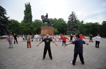 每周二與周五早上八點(diǎn),武術(shù)班都要在比什凱克市內(nèi)街心公園練習(xí)一小時(shí),此舉吸引了不少過路人的觀看和參與,成為了一道別具特色的風(fēng)景線,很受當(dāng)?shù)孛癖姎g迎。