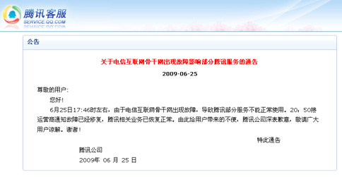 昨晚20時(shí)20分許,記者在騰訊官方網(wǎng)上看到一則《關(guān)于運(yùn)營(yíng)商設(shè)備故障影響部分騰訊服務(wù)的通告》已經(jīng)發(fā)布,回應(yīng)稱:6月25日17時(shí)46分左右,由于電信運(yùn)營(yíng)商出現(xiàn)設(shè)備故障,導(dǎo)致騰訊部分服務(wù)不能正常使用。騰訊正在積極配合運(yùn)營(yíng)商進(jìn)行故障排除。