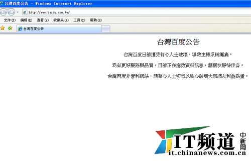 臺灣百度發(fā)布的公告稱:“臺灣百度日前遭受有心人士破壞,導(dǎo)致主機系統(tǒng)癱瘓。為有更好服務(wù)與質(zhì)量,目前正在搶救數(shù)據(jù)訊息,請網(wǎng)友靜待佳音。臺灣百度非營利網(wǎng)站,請有心人士切勿以私心破壞大眾網(wǎng)友利益為重!
