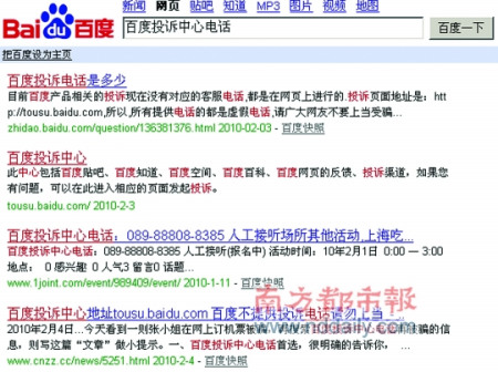 事態(tài)記者楊濤 報(bào)道 昨日,本報(bào)報(bào)道了山寨“百度投訴電話”被百度搜索置頂?shù)碾x奇事件,昨日,記者追訪此事時(shí)發(fā)現(xiàn),電話區(qū)號(hào)為“0898”的山寨“百度投訴中心”已經(jīng)不再置頂,但昨日晚間搜索時(shí),該網(wǎng)站仍然位列搜索結(jié)果的第三位。只是隨后的一條搜索結(jié)果提醒用戶,“百度不提供投訴電話,請(qǐng)勿上當(dāng)”。被騙的張小姐得知此消息后亦哭笑不得。她表示對(duì)此事報(bào)警的目的不在于索賠,但網(wǎng)絡(luò)的管理實(shí)在有待加強(qiáng)。