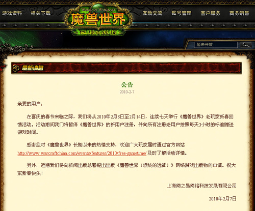 網(wǎng)易昨天是在一篇魔獸世界游戲內(nèi)活動的公告中披露上述消息的。公告稱將從2010年2月8日至2月14日,連續(xù)七天舉行《魔獸世界》老玩家新春回饋活動;顒悠陂g將暫!赌ЙF世界》的新用戶注冊,并向所有注冊老用戶按照每天3小時(shí)的標(biāo)準(zhǔn)贈送游戲時(shí)間。