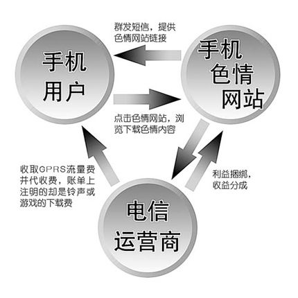 “簡單來說,一條手機色情信息內容的發(fā)布,一般要經過三個環(huán)節(jié):運營商(主要是指各種手機圖片、鈴聲、視頻、文字、游戲等內容發(fā)布平臺和渠道的提供者)、SP和WAP網站!北本┼]電大學一個曾長期關注移動增值業(yè)務的人透露,“SP在運營商和WAP網站間牽線搭橋,三者已形成捆綁各方的利益鏈,一旦獲利,三方都有收益!