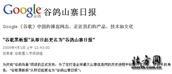 同時,為慶!肮萨濜B看”項目的正式發(fā)布,谷歌中國的官方博客“谷歌黑板報”也在今日“撰文宣布“改名”為“谷鴿山寨日報”。該博客稱:“為了在打造全球最大山寨信息網(wǎng)的歷史進(jìn)程中扮演好宣傳隊、鑼鼓手的角色,‘谷歌黑板報’從即日起更名為‘谷鴿山寨日報’”。但記者注意到,該日志的發(fā)布者署名為“谷歌愚人節(jié)項目組”,想必“谷鴿鳥看”和“谷鴿山寨日報”的改名行動都是今天這個特殊節(jié)日的一部分。