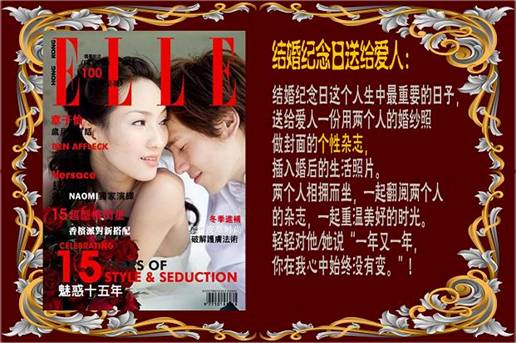 在情人節(jié)的清晨把它們放在餐桌上吧,當(dāng)身邊的戀人吃早餐時(shí),隨手拿起報(bào)紙和雜志,當(dāng)看到印刷精美的雜志時(shí),發(fā)現(xiàn)自己竟然上了雜志的封面、成為雜志的封面人物。一定不敢相信自己的眼睛,會(huì)大吃一驚的!為了效果更好,強(qiáng)烈建議買家把個(gè)性的封面、內(nèi)頁跟真雜志裝訂在一起,這樣就更像一本正式發(fā)行的雜志,這樣也就更會(huì)讓對(duì)方有意想不到的驚喜了!
