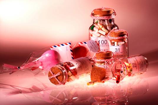 這就是很有人氣、創(chuàng)意兼可愛的情書膠囊,號(hào)稱用整瓶甜蜜的膠囊,道出永遠(yuǎn)愛你的理由,補(bǔ)充關(guān)懷、補(bǔ)充愛!玄機(jī)在哪里?打開它試試看吧!原來每個(gè)膠囊里面都藏有一個(gè)空白小紙條,用來寫下對(duì)愛人想要說的話,寫好后把它卷起來用膠囊里精致的金屬小環(huán)套住再放回去。如此炮制一周用量的愛,當(dāng)然,只要你的情話源源不絕,那么預(yù)約一整年的愛意表達(dá)也很不錯(cuò)。寫好后,趕快把它們交給專屬你的“病號(hào)”,記得要叮囑對(duì)方每日服用,相信沒有誰可以抵抗得了這份浪漫,發(fā)現(xiàn)秘密后得到的意外驚喜一定會(huì)讓其感動(dòng)良久。